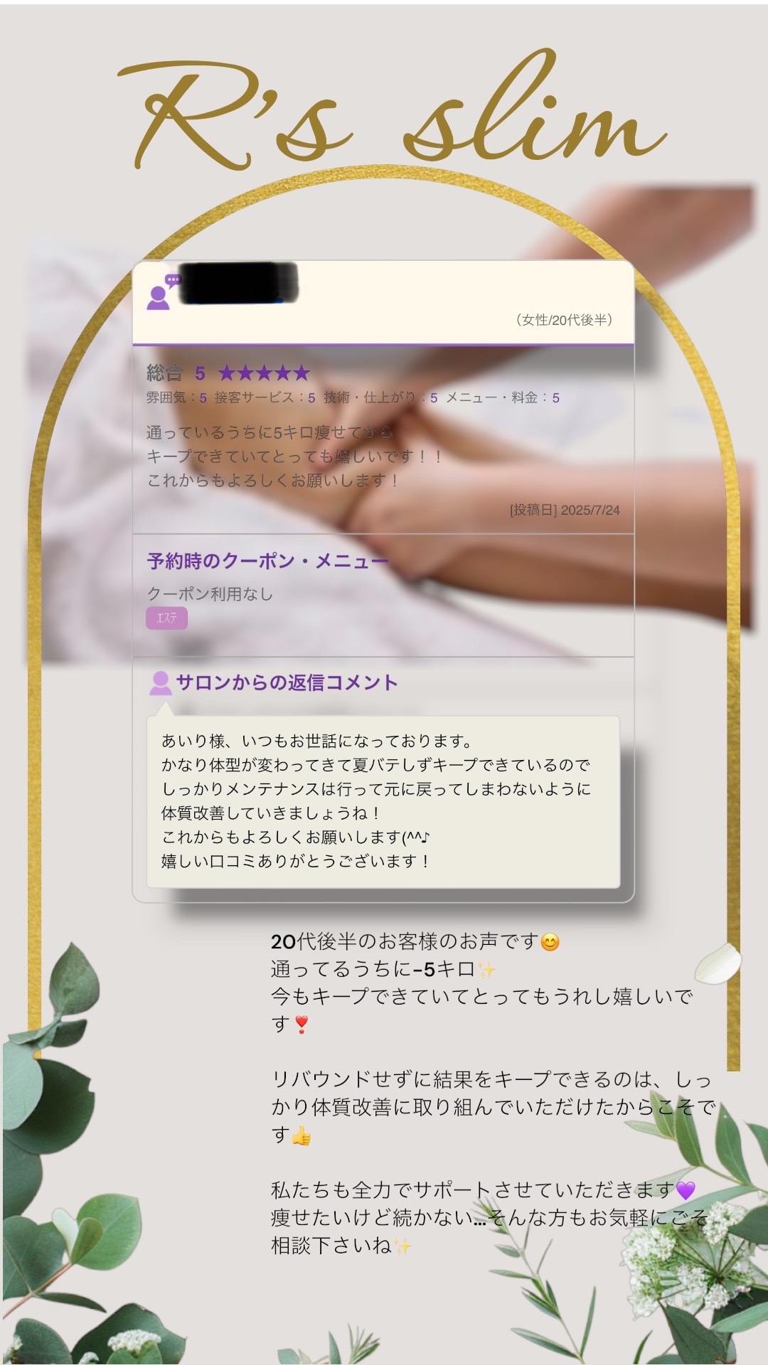 岐阜県岐阜市のR’s slim(アールズスリム)は痩身ダイエットエステ・小顔専門店です。「痩せたいけれど全然痩せられないからもう諦めそう…」そんなお悩みをお持ちの方はいらっしゃいませんか?R’s slim(アールズスリム)ではエステ歴20年、延べ2万人以上のお客様を施術してきたエステティシャンが施術させて頂くので、過去に培ってきた経験や知識・技術力を活かし、お客様に心から満足して頂ける事が可能です。「ダイエットはしんどいもの」と思っていらっしゃる方も多いかもしれません。ですがそうではありません。実際に過去に20kgの減量に成功した過去があるからこそ、施術だけでは無く、ダイエットについてのアドバイス等もさせて頂きます。お客様のお悩みに共感し、そのお悩みに寄り添い、共にそのお悩みを解決していけるように、じっくりとヒアリングさせて頂きます。お1人お1人身体に関するお悩みはもちろん違います。だからこそ、お1人お1人のお悩みに合った施術を行わせて頂きます。R’s slim(アールズスリム)はお客様がもっと美しく、もっと輝けるお手伝いをさせて頂きます。「痩せる事を諦めたくない」そんな方は岐阜県岐阜市のR’s slim(アールズスリム)にお任せください!